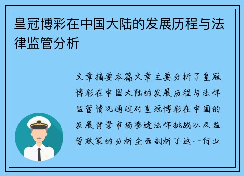 文章摘要:本篇文章主要分析了皇冠博彩在中国大陆的发展历程与法律监管情况。通过对皇冠博彩在中国的发展背景、市场渗透、法律挑战以及监管政策的分析,全面剖析了这一行业在中国的兴起与监管演变。文章首先回顾了皇冠博彩在中国大陆的历史背景,从早期的线上赌博到成为一个庞大的博彩网络,分析了其市场扩展与行业结构。接着,文章探讨了中国对博彩行业的法律监管框架,重点分析了国内相关法律法规的制定与执行。文章还深入探讨了政府与执法机构如何应对皇冠博彩在中国的影响,分析了国内法律政策如何与国际市场互相博弈。最后,本文对皇冠博彩的发展趋势及其在中国大陆的法律前景进行总结,提出未来可能的变化与挑战。
